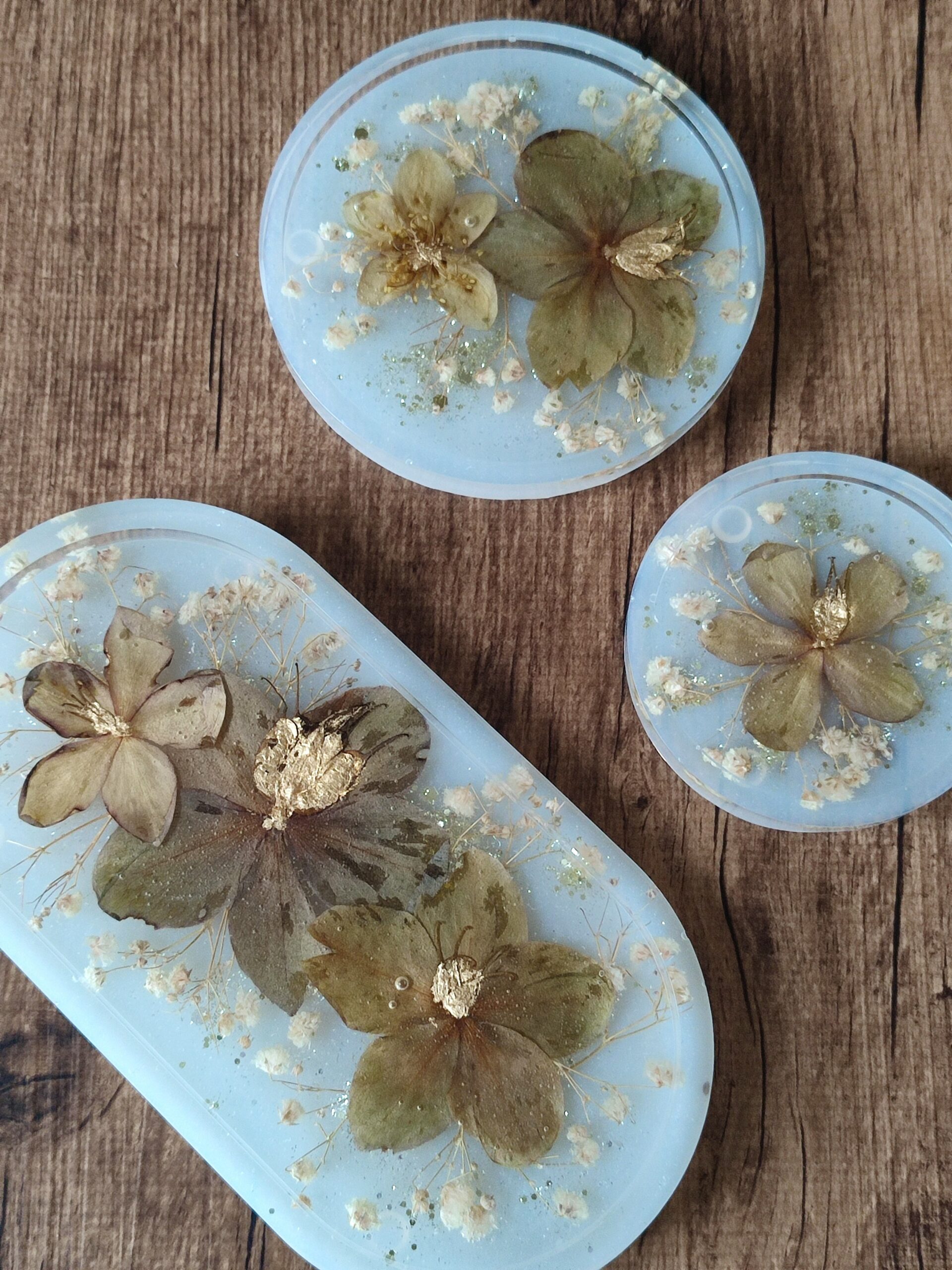 Résine, fleurs et feuille d’or